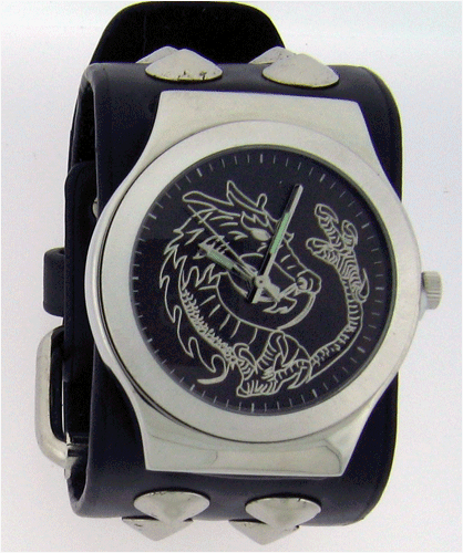 --> Details : Black Dragon Wide Black Silver Stud Leather Band Circle Trendy Design Steel Black Dial Gothic Punk Biker Wristband Watch